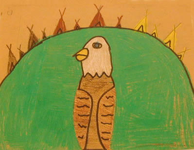 by Haleigh In my picture you can see tipis that represent different tribes. They are on top of the hills and the green shows mother earth. The eagle came to me. It seems that eagles are connected to my art. I watch Eagles diving, skimming over the water. Eagle means messenger to the Stoney people. |