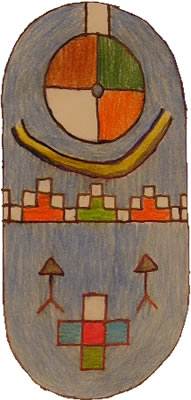 By Jeremy I did my art in this shape because I wanted it to be unique. The reason I used blue so much is because it is one of the Stoney colors and I want the design to look like it is in the sky. The big circle at the top means changing seasons; every color is a different season. I know that orange stands for protection white means Creator, yellow stands for sun and green means mother earth. |