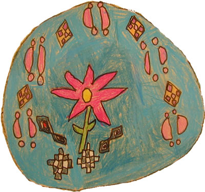 by Jessie My art is all inside a circle and everything is balanced inside the circle. The background is blue because it is sky. I put a flower in the middle because Stoney artistry sometimes had flowers in it. There is lots of pink which is floral and pink also shows sun set and sun rise. The center of the flower is yellow. It means sun. Below the flower is a design I made that is like two mountains put together. The blue means sky and the white means creator. |