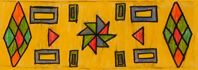 by: Kegan In my art the yellow background shows the sun shining down on the Earth. The diamonds in my artwork show land and spirits. The orange points on the diamonds represent protection for the land and spirits. The triangle thing in the middle is my favorite because of the colors. The blue and yellow rectangles show sky and sunshine, and the green and blue rectangles show land and water. The red triangles show the changing seasons. |