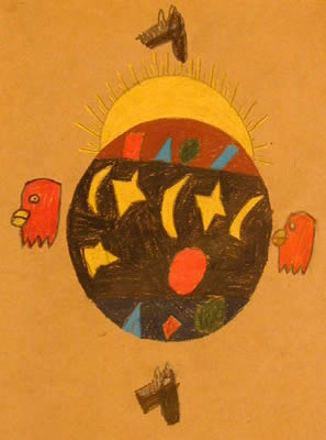 by Kevin Circles mean the circle of life, that is why I chose many circles in my artistry. I have shown the sun setting and night is coming. Stars and moons were probably important in Stoney life because they helped them find their way home. I put animals in my art because Horse helped the Stonies hunt and Eagle was God's messenger. When you see an animal it is showing itself for you. |