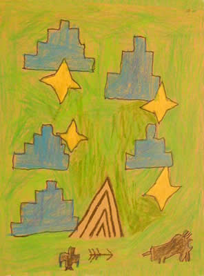 by Rowan I kept dreaming about the natives. This picture tells the story of a Stoney who was hunting in the mountains. He was hunting at nighttime and he shot a buffalo. The stars are so bright they help him see the buffalo. Behind the hunter there is a tipi. The tipi is in the mountains where the Stonies lived. Sometimes the Stonies told stories of things that had happened in their art, that is what I did. |