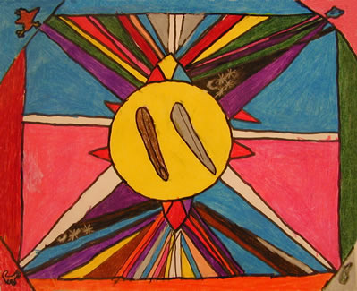 by Teagan In my picture, the two feathers in the middle of the circle means the creator. All the colours attach to the circle because the creator is everything. The circle means everything is equal. Blue is sky. The pink in my picture means the sun set. In the 4 corners of my picture, there are special animals to tell about how the animals connect to the Creator. The eagle is for the flying ones. The fish represents the water creatures. The snake represents the low-legged and the mountain lion is for the four legged. |