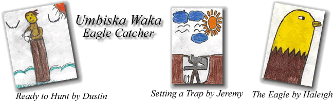Waka Eagle Catcher Our summary of the Ancient Story told by Jeremy, Haleigh, DustinThere was a Stoney eagle catcher. One night he had a dream that he caught four eagles. When he woke up he went to the mountains and talked to Great Eagle. Great Eagle told him that the gift of making the eagle feather head-robe was his but only if he caught 4 eagles. The eagle catcher set a trap for the eagles and waited. He was only supposed to catch 4 eagles but he tried to catch the 5th eagle he was taken away to four fierce warriors; Bull Elk, Mountain cougar, She-Grizzly and Great White Bull Buffalo. Eagle catcher gave the four warriors each a sacred eagle feather. Umbiska goes back to his lodge with the 4 eagles. In the winter a child was born and he started to turn into an eagle. Umbiska named him Eagle Child and in the spring had a Sun Dance for him. Eagle Child grew wings and flew away with his father Great Eagle. Great Eagle left a feather and told Umbiska that this feather was for the top of your head robe. He told him to hold the Sun Dance for ten winters and then no one would die. What did we hear in this story that we have heard in other stories?