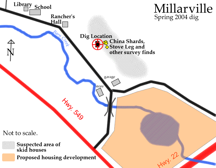 After we completed the sample locations, we needed to decide on the most likely place for our main dig. The samples we gathered seemed to form a pattern: the closer to the road we went, the more we found. We asked Mrs. Prestie again about what she remembered. She really thought that going further south from the existing ball diamond would be the most likely spot. She could name three families that could have lived there: Gunderson, Sewell and Judson. The Judson's were the family that collected old cars.
