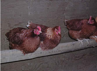 Some of our chickens are on the roosting bar. They are looking at the feed and the water that is on the ground. |