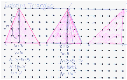 Students working on Lines, Shapes and Spaces also had access and were encouraged to explore a wide range of authentic mathematical options to express their emerging understandings. Students were free to choose from a variety of digital and more conventional measuring instruments to calculate length, width, height and diameter. Several students purposely chose the most difficult route – they figured out the correct scale they must use to measure their shapes directly from their computer screens. Another student, in the diagram shown here chose to use a geoboard,